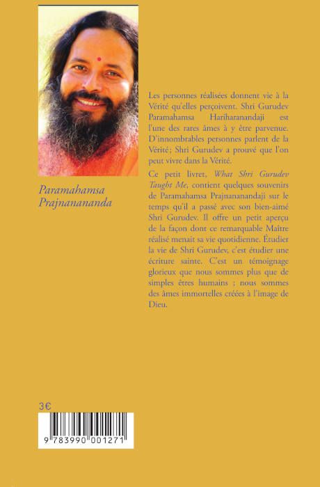 Ce petit livret, What Shri Gurudev Taught Me, contient quelques souvenirs de Paramahamsa Prajnananandaji sur le temps qu’il a passé avec son bien-aimé Shri Gurudev. Il offre un petit aperçu de la façon dont ce remarquable Maître réalisé menait sa vie quotidienne. Etudier le vie de Shri Gurudev, c’est étudier une écriture sainte. C’est un témoignage glorieux que nous sommes plus que de simples être humains; nous sommes des âmes immortelles créées à l’image de Dieu.