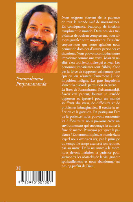 Le livret de Paramahamsa Prajnanananda, Savoir être patient, fournit un remède opportun et éprouvé pour un monde souffrant de stress, de difficultés et de problèmes inimaginables. Il suscite la réflexion et la guérison. En pratiquant l’art de la patience, nous pouvons surmonter les difficultés et nous pouvons créer un environnement qui encourage les autres à faire de même. Pourquoi pratiquer la patience? En termes simples, le monde dans lequel nous vivons est régi par le principe du temps: le temps avance à son rythme, pas au nôtre. De la naissance à la mort, nous devons maitriser la patience pour surmonter les obstacles de la vie, grandir spirituellement et nous abandonner au timing parfait de Dieu.